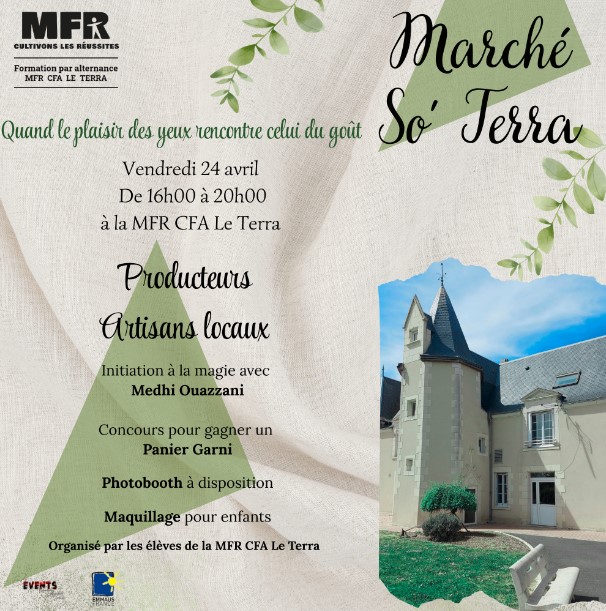 Le vendredi 24 avril prochain, la MFR CFA Le Terra invite les habitants du Thouarsais à la première édition de son "Marché So’ Terra". De 16h00 à 20h00, l’établissement se transformera en un lieu d'échange et de convivialité, où "le plaisir des yeux rencontre celui du goût".