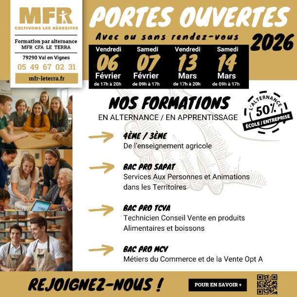 La MFR-CFA Le Terra ouvre ses portes au public les vendredi 6 février 2026 de 17h à 20h et samedi 7 février 2026 de 9h à 17h, à Val en Vignes. Ces portes ouvertes sont l’occasion de découvrir un établissement de formation par alternance, d’échanger avec l’équipe pédagogique et de mieux comprendre les parcours proposés aux jeunes. Formations présentées : Classes de 4ᵉ et 3ᵉ de l’enseignement agricole Bac Pro SAPAT – Services aux Personnes et Animation dans les Territoires Bac Pro TCVA – Technicien Conseil Vente en Alimentation Bac Pro MCV – Métiers du Commerce et de la Vente Les visites se font avec ou sans rendez-vous. Informations et renseignements sur place.