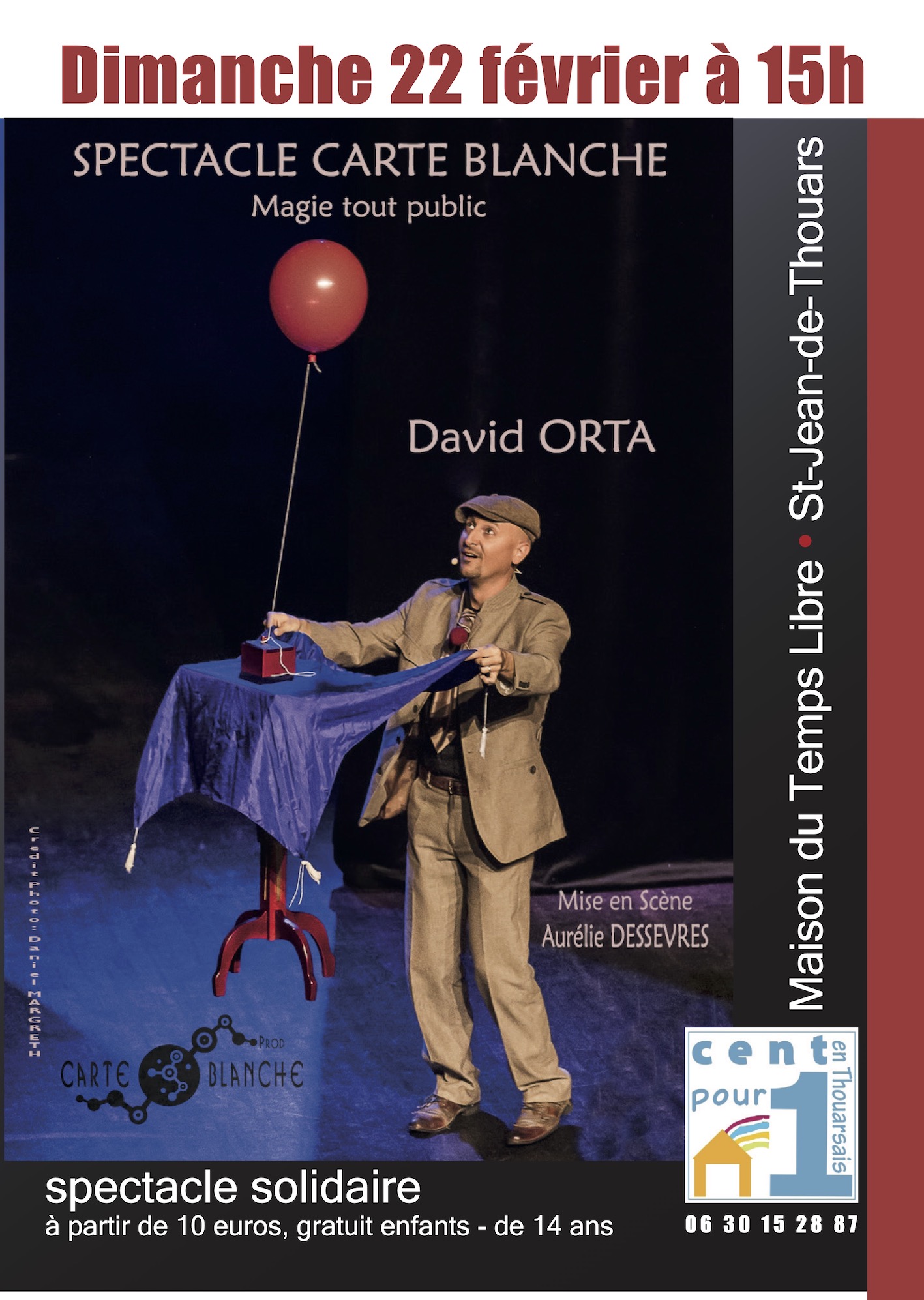 Spectacle Solidaire : "Carte Blanche" avec David Orta : Magie pour tous, spectacle familial au bénéfice de "Cent pour un en Thouarsais". Maison du Temps libre à St-Jean-de-Thouars, 22 février à 15h (infos : 0630152887), à partir de 10 euros, gratuit - de 14 ans.
